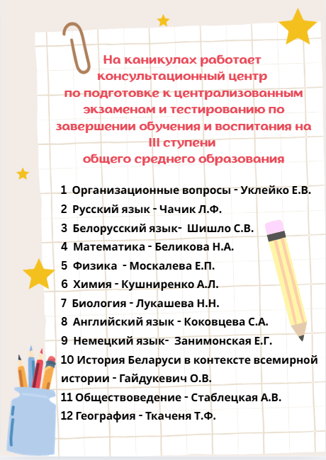 На каникулах работает консультационный центр по подготовке к централизованным экзаменам и тестированию по завершении обучения и воспитания на III ступени общего среднего образования