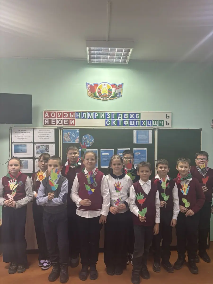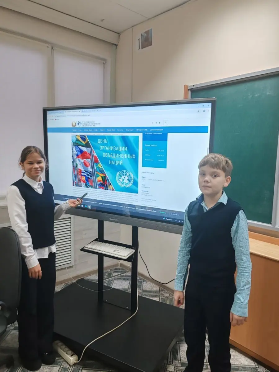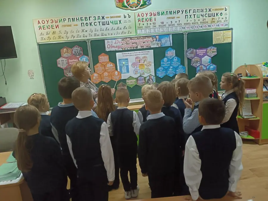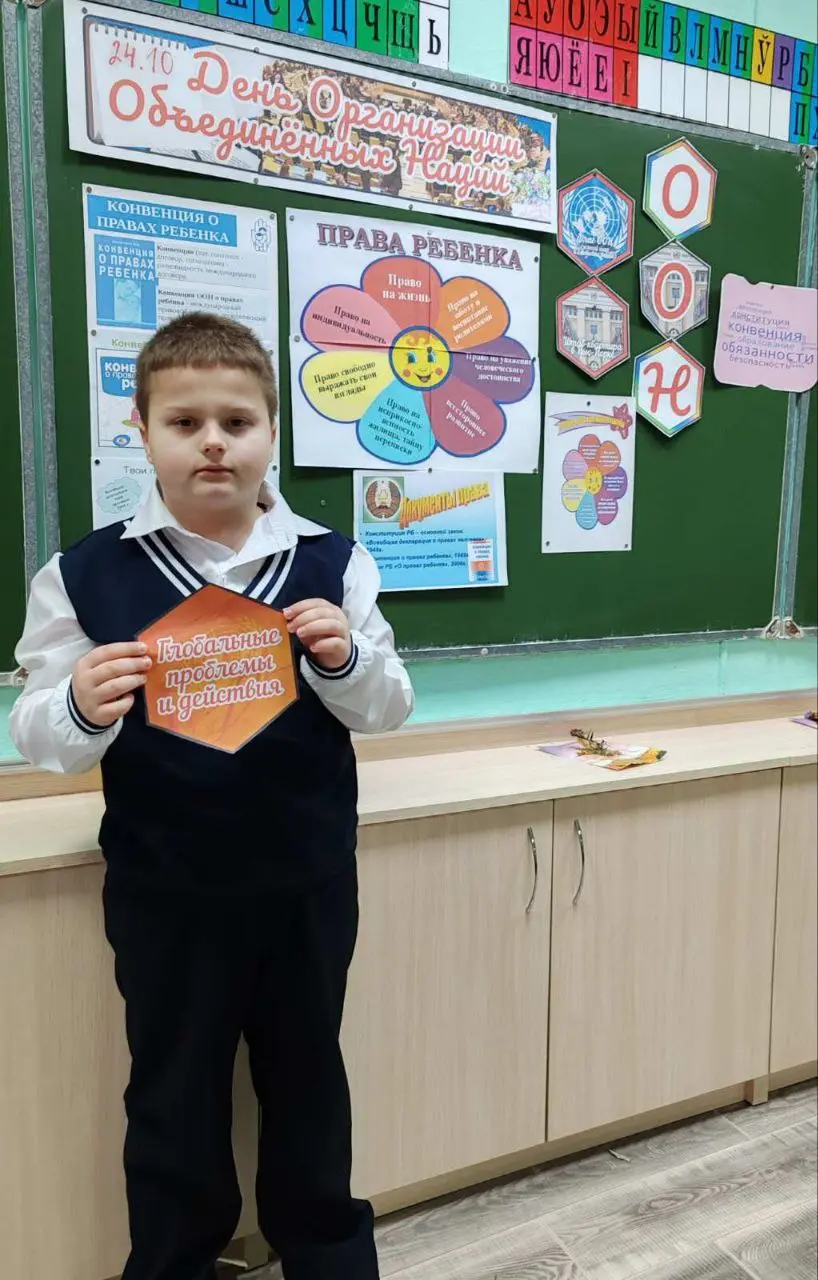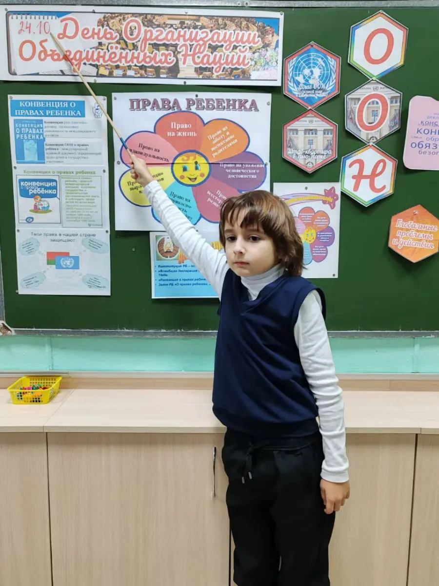 -В 7б классе прошло занятие, посвященное данному событию. С 1945 года Республика Беларусь является членом ООН. 193 страны, входящие в состав ООН, совместно решают главные цели и задачи на планете: сохранить мир и защитить права людей.