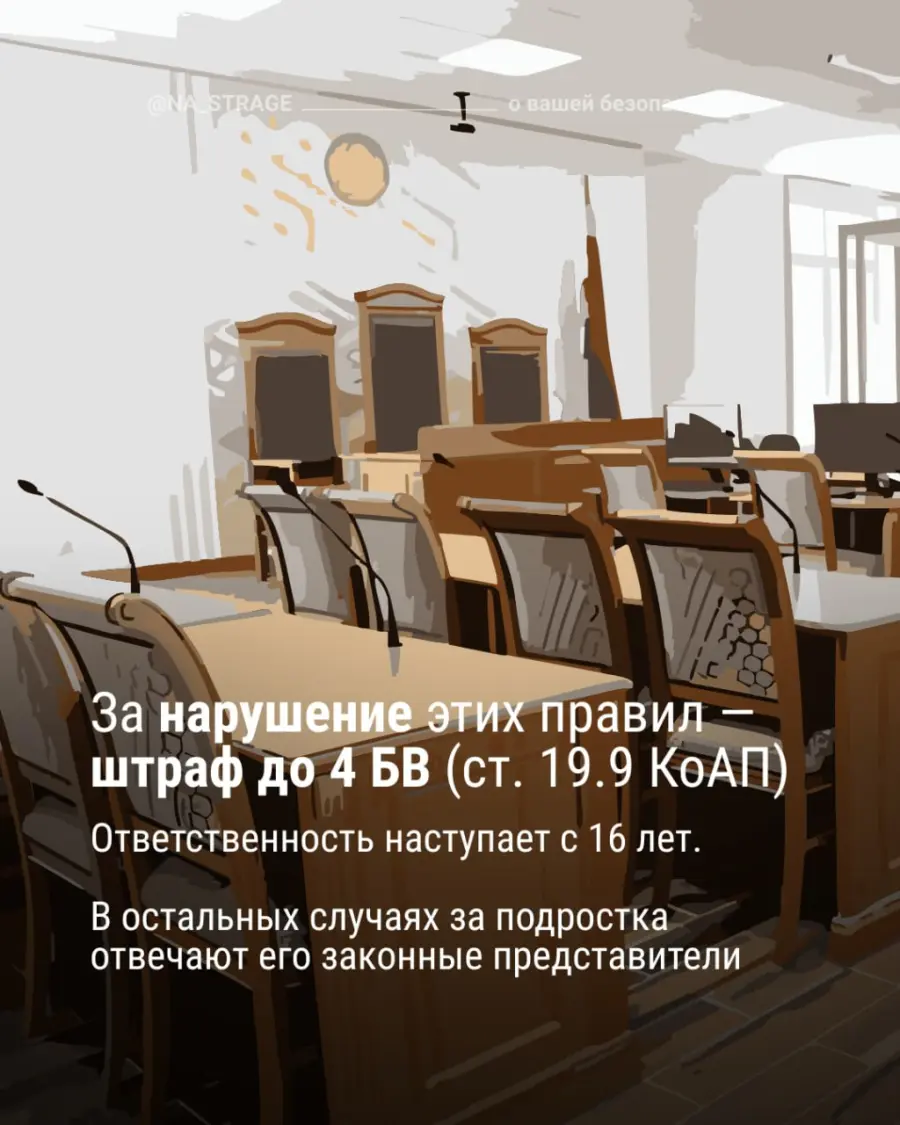 За нарушение этих правил предусмотрен штраф до 4 базовых величин, в соответствии со статьей 19.9 КоАП. Ответственность наступает с 16 лет. В остальных случаях за подростка отвечают его законные представители.