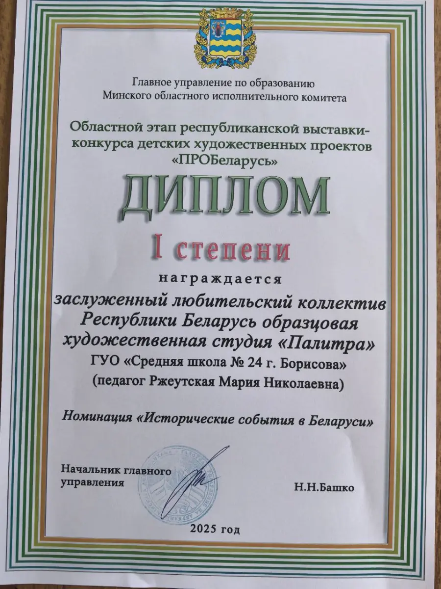 Насковец Виктория, Бык Ксения, Готовка Агата, Лукашевич Валерия, Соколовский Софья, Ховалко Милана, Загородняя Анастасия, Любаева Виктория, Мазур Софья, Гулида Вероника, Толстик Анастасия, учащиеся Заслуженного любительского коллектива Республики Беларусь образцовой художественной студии «Палитра» государственного учреждения образования «Средняя школа № 24 г. Борисова» - победители областного этапа республиканского конкурса «ПРОБеларусь»!!!