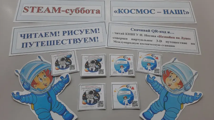 А в заключении каждый участник получил в подарок открытку с QR- кодом для чтения книги с яркими рисунками о Незнайке онлайн и открытку с QR-кодом с виртуальным 3D путешествием по настоящей международной космической станции.