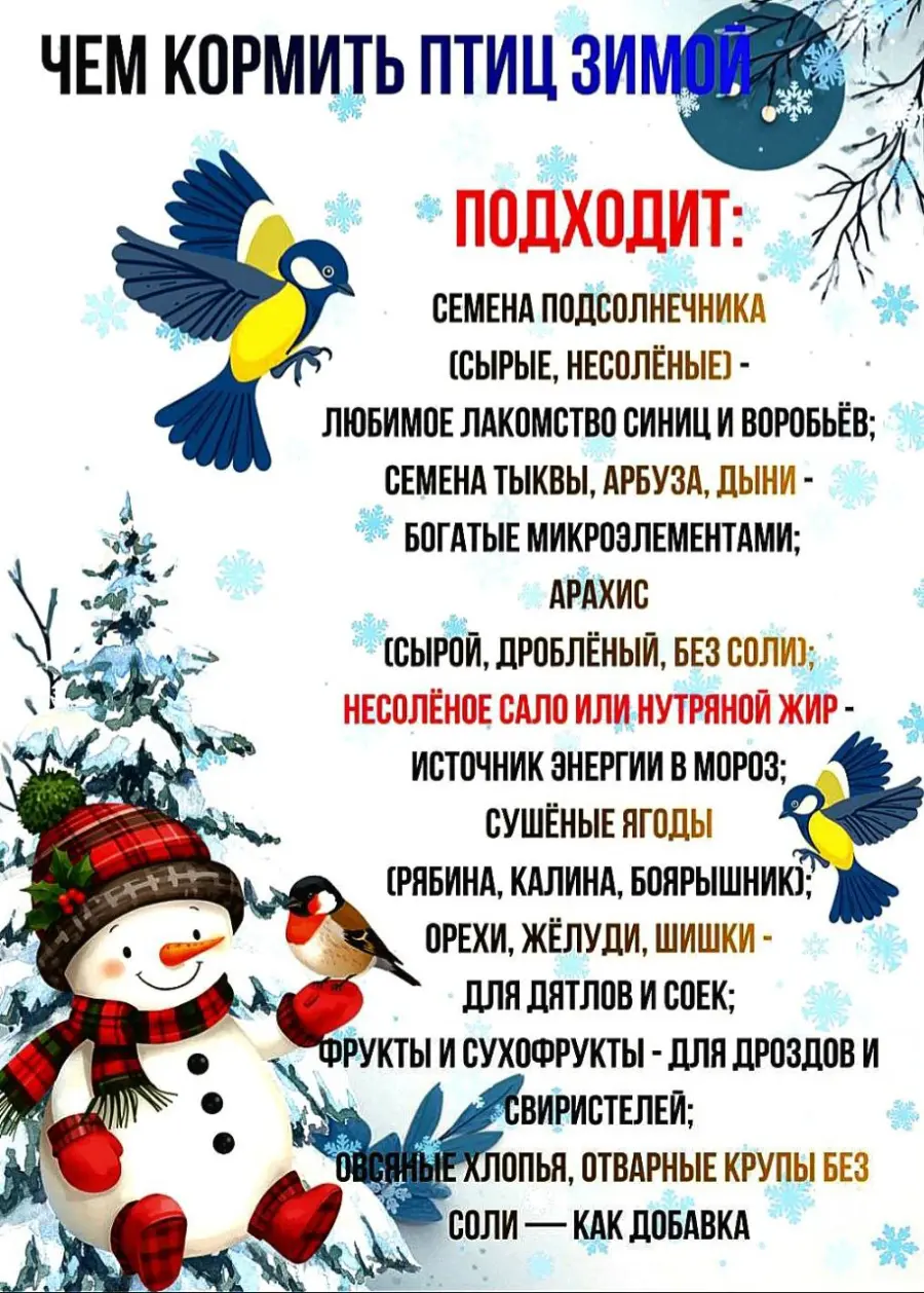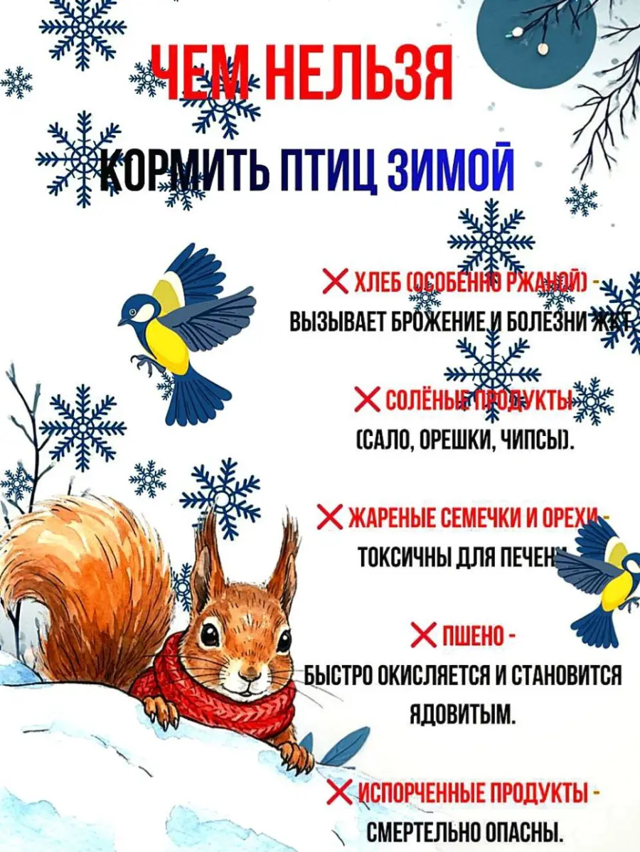 Библиотека напоминает: голодная птица сильно страдает от зимнего холода, поэтому нам нужно поддержать птиц, сделать для них кормушки и не забывать подсыпать для них корм.