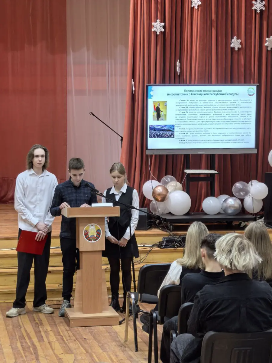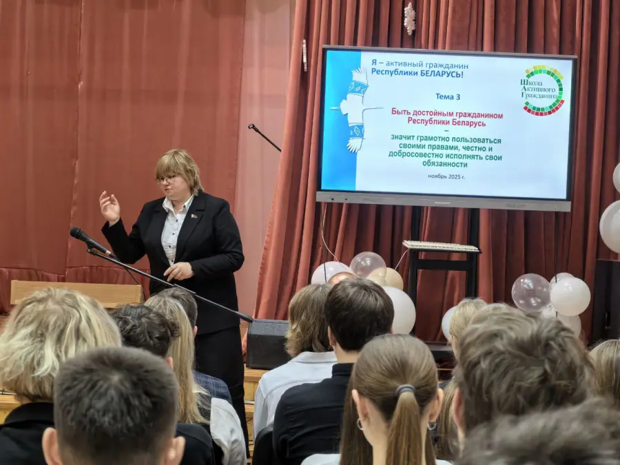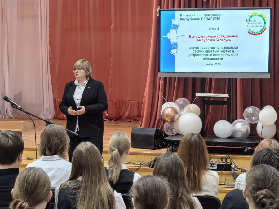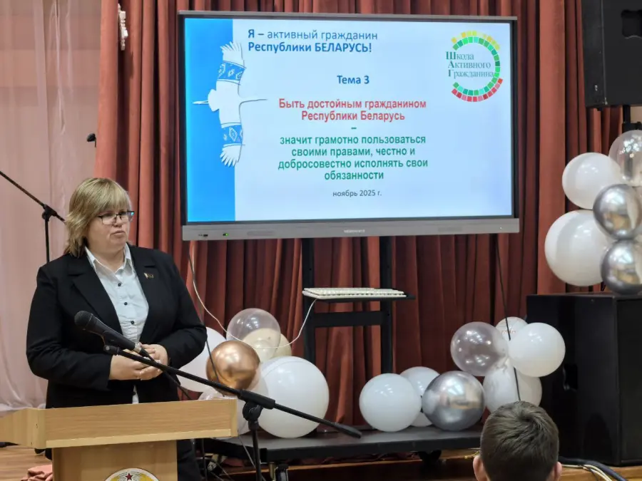 27.11.2025 в рамках проекта «Школа Активного Гражданина» состоялось заседание с участием Прокопенковой Т.Н., депутатом 27 созыва Совета депутатов Борисовского района по теме «Быть достойным гражданином Республики Беларусь – значит грамотно пользоваться своими правами, честно и добросовестно исполнять свои обязанности».