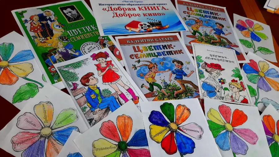 Ребята познакомились с жизнью и творчеством советского писателя, его известными книгами и сказками. Посмотрев мультфильм "Цветик-семицветик", снятый по этой же сказке, все вместе обсудили книгу, поговорили о положительных и отрицательных человеческих качествах, выяснили, что эта сказка учит добру, честности, отзывчивости к людям ,учит помогать всем, и особенно тем, кто в этом нуждается.